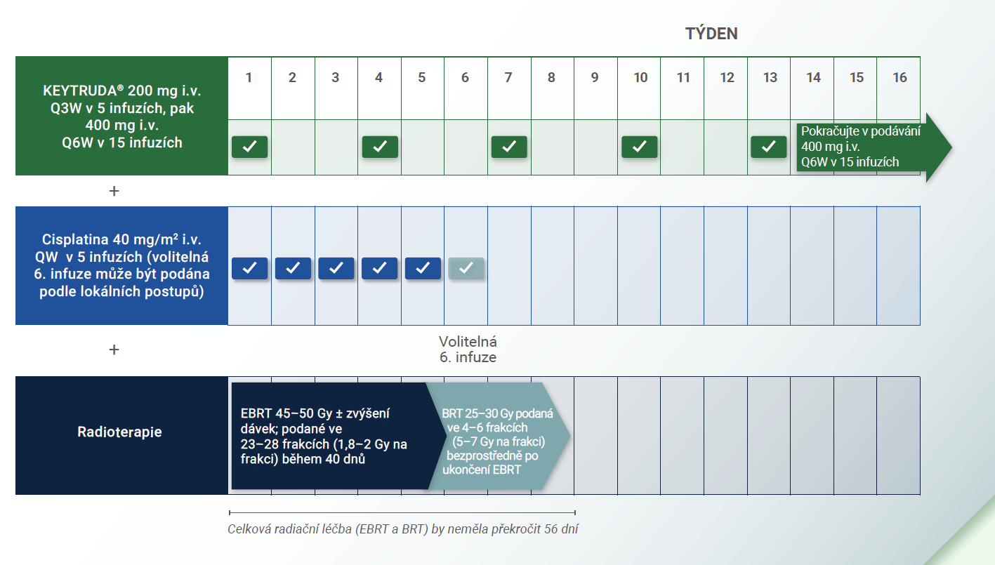 U lokálně pokročilého karcinomu děložního hrdla by pacientky měly být léčeny přípravkem KEYTRUDA® současně s CRTa a následně monoterapií přípravkem KEYTRUDA® až do progrese onemocnění, nepřijatelné toxicity nebo až 24 měsíců.1