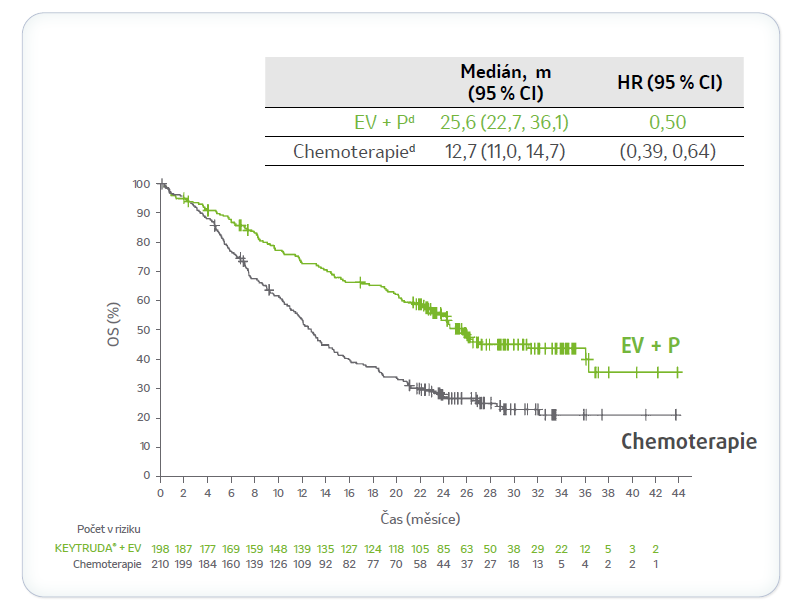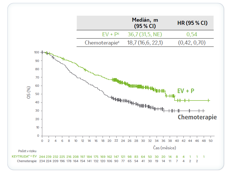 Medián OS: 33,8 měsíce při léčbě kombinací KEYTRUDA® + EV (26,1, 39,3) v porovnání s 15,9 měsíce při léčbě gem/plat (13,6, 18,3)