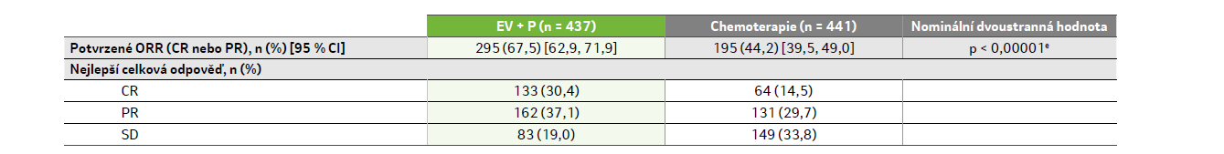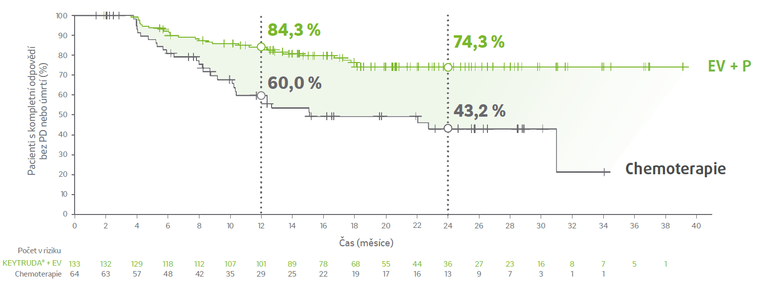 - PFS HR = 0,36; 95% CI: 0,21, 0,61; odhadovaná míra 24měsíčního PFS: 78,2 % pro EV + P oproti 53,7 % pro chemoterapii