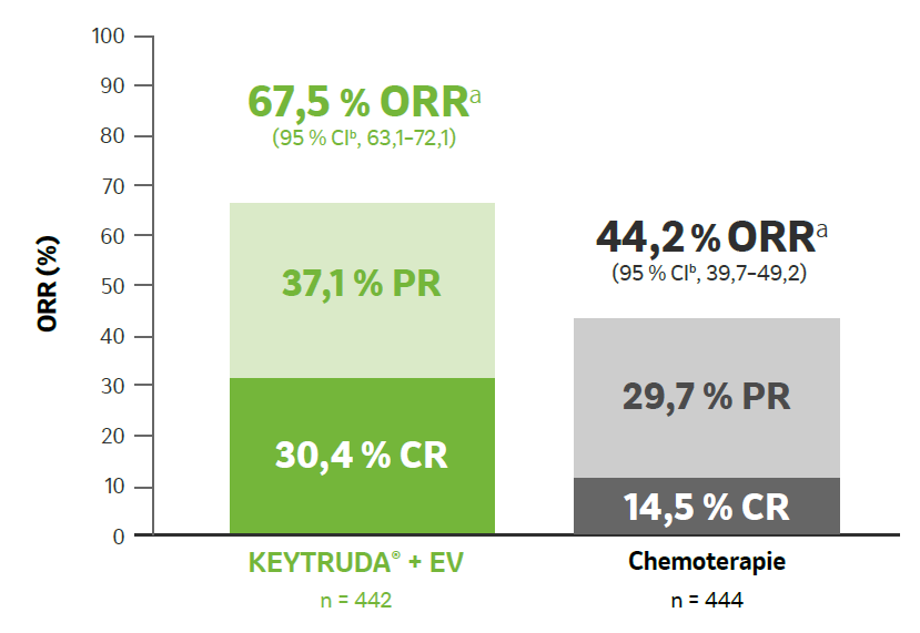 67,5 % ORRa při léčbě kombinací KEYTRUDA® + EV (95% CI: 63,1 %, 72,1%) v porovnání s 44,2 % při léčbě gem/plat (95% CI: 39,7 %, 49,2 %) (p < 0,0001)b